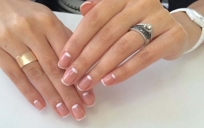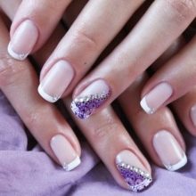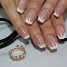 French Manicure ist eine der gefragtesten der Welt. Es besticht durch sein natürliches Design in gedeckten Farben. Diese Maniküre ist vielseitig, so dass sie nicht nur von erwachsenen Frauen, sondern auch von jungen Menschen getragen werden kann. Bei Bedarf kann die French Manicure mit Dekor (in begrenzten Mengen) ergänzt werden. Meistens wird ein feines Muster auf die Nagelplatte aufgebracht und 1-2 Nägel werden mit Kieselsteinen verziert.