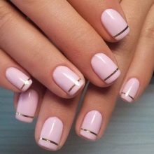 Oft wird ein solches dekoratives Band zu einem wesentlichen Element bei der Herstellung einer Mondmaniküre oder -jacke. Die zeitweise Verwendung beschleunigt die Arbeit an der Gestaltung von Nägeln und ermöglicht es Ihnen, die Linie am Rand des Nagels oder in der Wachstumszone so gleichmäßig wie möglich zu gestalten.