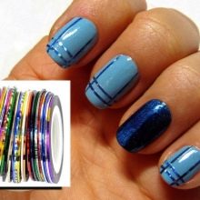 Eines der am häufigsten verwendeten dekorativen Elemente ist Klebeband. Dank seiner Anwendung können Sie eine unglaubliche Menge einer Vielzahl von Designs erstellen. Die Position auf der Nagelplatte kann chaotisch oder im Voraus gut durchdacht sein.