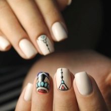 Geometrische Muster und ethnische Muster liegen immer im Trend. Maniküre mit ihnen kann als universell angesehen werden. Die geometrische Komponente „streckt“ visuell kurze Nägel und verengt die breiten. Um diesen Effekt zu verstärken, hilft das korrekt ausgewählte Farbschema des Lacks.