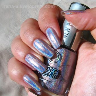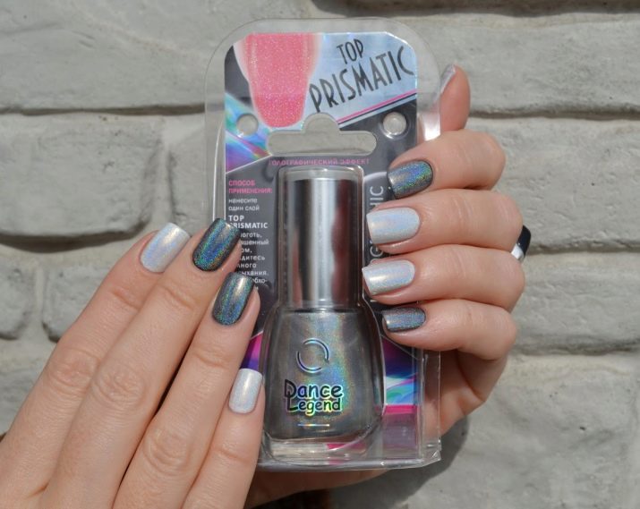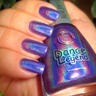 Ein weiterer Lack von Dance Legend hat eine Geleestruktur und enthält Partikel mit holographischem Effekt. Wenn Sie diese Beschichtungen verwenden, benötigen Sie keine Oberseite, sie sind gleichmäßig im Nagel verteilt, trocknen innerhalb von 10 Minuten aus und werden schnell entfernt (falls erforderlich). Lacke haben eine sanfte chemische Zusammensetzung, können bei unterschiedlicher Beleuchtung ihre Farbe ändern.