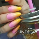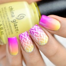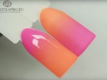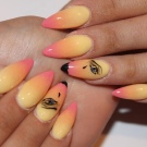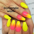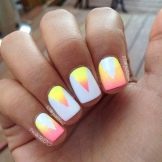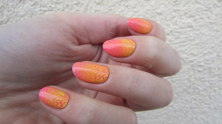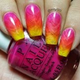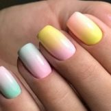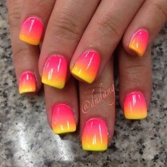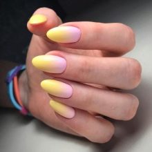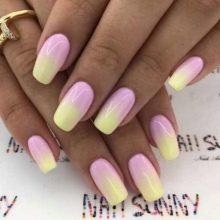 Der Gradient der gelb-rosa Farbe kann in verschiedenen Variationen durchgeführt werden. Die Farbkombination wird als horizontale und vertikale Übergänge ausgeführt. Die zweite Option kann mit Ombre kombiniert werden, wenn die Helligkeit der Töne mit jedem nachfolgenden Nagel zunimmt. Die Farbintensität wird nicht nur durch hellere Gelb- und Rosatöne reguliert, sondern auch durch die Anzahl der aufgetragenen Lackschichten. Die modischste Variante ist das asymmetrische Ombre. Dies ist eine weitere Gelegenheit, eine helle Individualität und Einzigartigkeit zu betonen.