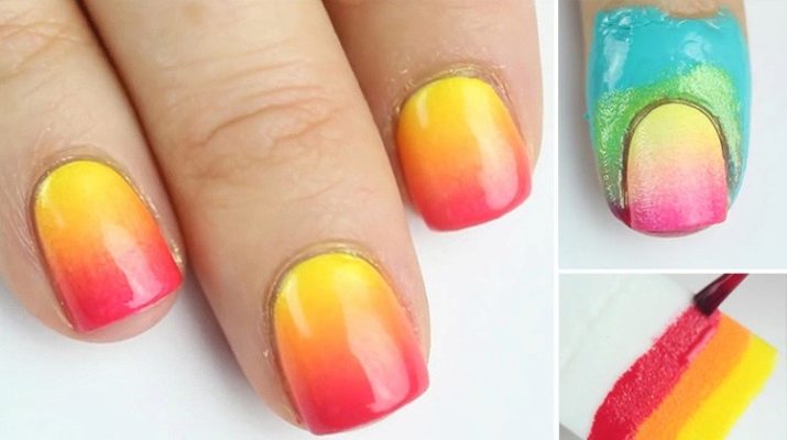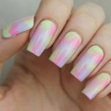 Es gibt einen alternativen Weg. Es ist einfacher für diejenigen, die nur die Ombre-Technik beherrschen. Nach der Vorbereitung der Arbeitsfläche wird der Lack nicht sofort aufgetragen. Zuerst werden alle Farben eines Nagels gemischt und auf der Palette gedehnt, dann werden sie mit einem feuchten Schwamm auf die Oberfläche übertragen. Der feuchte Schwamm wird einfach gegen die fertige Schablone gedrückt und auf die Arbeitsfläche gedruckt.