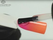 Nach dem Auftragen und Trocknen der Basis wird die Haut um jeden Nagel mit Creme bestrichen. Das Verfahren hilft dabei, unerwünschte Lackreste leicht zu entfernen. Als nächstes kommt die Abstufung. Es verläuft in Richtung von der Basis bis zu den Spitzen. Dementsprechend wird jede nachfolgende Schicht überlagert.Die zweite Farbe wird in geringem Abstand von der Nagelbasis aufgetragen. Hier müssen Sie selbst navigieren und die ungefähre Entfernung in Abhängigkeit von der Anzahl der Töne bestimmen.