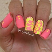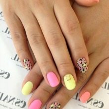 Viele Fashionistas sind besorgt über die übermäßige Helligkeit der Maniküre. Dieses Problem ist leicht zu beheben, selbst wenn das Design in Rosa und Gelb gehalten ist. Machen Sie dazu die Beschichtung matt. Es gibt verschiedene verfügbare und einfache Optionen. Im ersten Fall können Sie einfach einen matten Lack kaufen.