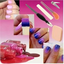Nach der Bearbeitung der Nägel wird eine Basis auf ihre Oberfläche aufgebracht. Es kann entweder ein Festigungsmittel oder ein transparenter oder farbiger Lack sein. Wenn die letzte Option ausgewählt ist, müssen Sie den hellsten Farbton in der Palette verwenden. Im Ombre sieht die Tonalität der Nägel von einer hellen Basis bis zu dunklen Spitzen am beeindruckendsten aus. Für die weitere Arbeit benötigen Sie eine Reihe farbiger Lacke, eine fettige Creme (für die Hände), einen Schwamm, eine Bürste zum Dekorieren (Sie können einen Zahnstocher verwenden), eine kleine Palette zum Mischen, ein Fixiermittel und Watte (Tampons).
