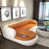 Sieht gut aus in großen Räumen und Kompositionen aus eckigen oder geraden StrukturenZum Beispiel, wenn sich die Sofas gegenüberliegen und zwischen ihnen ein quadratischer Tisch steht. In kleinen Wohnungen aus kompakten Direktmodellen werden Akzentoptionen geschaffen - die kreative Form und Farbgebung des Sofas heben sich wie eine Art Highlight deutlich von den übrigen Möbeln ab.
