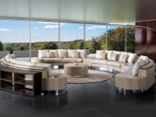Zum Beispiel passt alles bequem auf ein Sofa um einen Tisch der gleichen Form - eine so gemütliche Insel ersetzt perfekt ein normales Essmöbel-Set - einen Tisch und Stühle. Die Hauptnachteile runder Designer-Sofas sind, dass sie nicht für kleine Wohnungen und kleine Flächen geeignet sind, viel Platz benötigen, die Bewegungsfreiheit einschränken und hohe Kosten verursachen.