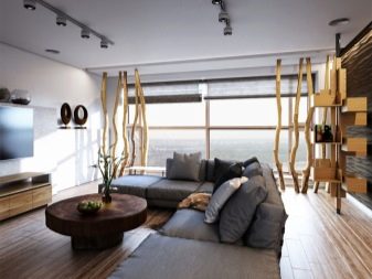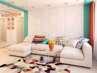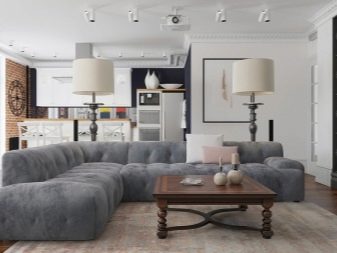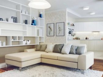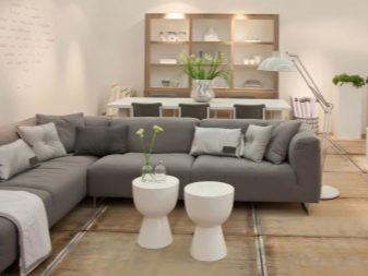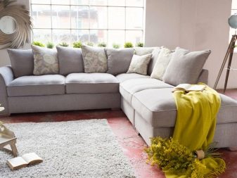 Aber im Vergleich zu anderen Modellen, Ecksofas ermöglichen die effizienteste Nutzung des Freiraums des Raums - belegen Sie nicht genutzten Bereich und lassen Sie maximal Freiraum für Bewegung. In Studio-Apartments werden mithilfe von Eckelementen aus Polstermöbeln separate Zonen erstellt, die die Räume optisch voneinander trennen. Grundsätzlich verwenden Designer Ecksofas, um einen Platz zum Ausruhen zu schaffen, einen Essbereich in einer Küche, häufig werden Eckmodelle in Büroräumen installiert.