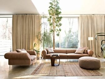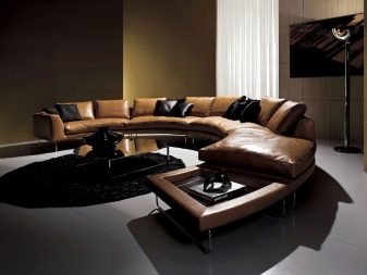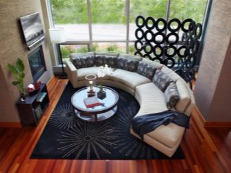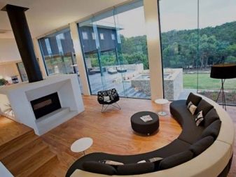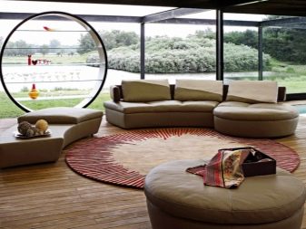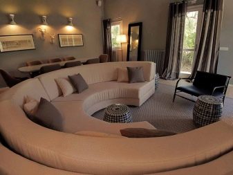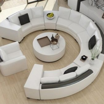 In modernen Designlösungen finden sich häufig runde sogenannte Ringsofas. Eine Besonderheit solcher Möbel ist, dass sie ohne hohe Rückwand hergestellt werden, so dass das Modell von beiden Seiten gut aussieht. Die Installationsmöglichkeiten beschränken sich nicht nur auf die Wandmontage. Sie befinden sich in der Mitte des Raums, und Schränke und Regale mit Büchern sind in der Nähe der Wände installiert. Halbkreisförmige Sofas ohne Rückenlehne sehen in der Nähe von Kaminen in Lounges, Fluren und Wohnzimmern gut aus.