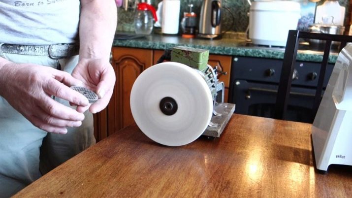 Wir starten das Gerät und drücken die Messerklingen vorsichtig auf den Drehkreis. Der Neigungswinkel der Blütenblätter sollte ungefähr siebzig bis achtzig Grad betragen, die Erhaltung der Winkel ist hier wichtig. Sie müssen ständig die geschliffene Oberfläche überwachen und das Metall rechtzeitig abkühlen lassen, um es nicht zu verbrennen. Um das gleiche Verfahren mit dem Grill durchzuführen, aber um Schäden an der Haut der Finger zu vermeiden, verwenden Sie denselben Holzblock zum Pressen.