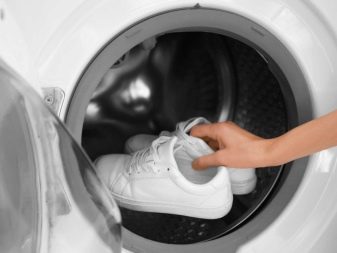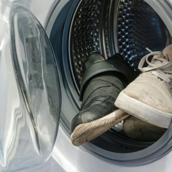 Waschen Sie gleichzeitig in der Maschine nicht mehr als 2 Paar Schuhe. Wenn Sie mehr geben, verschlechtert sich die Qualität der Wäsche, und die Schlagkraft auf die Trommel nimmt zu. Sie legen Produkte ohne Schnürsenkel und Einlegesohlen in das Gerät. Einlegesohlen können während des Waschens verformt werden. Es ist besser, sie separat und manuell zu waschen. Die Schnürsenkel verdrehen sich und beeinträchtigen den Arbeitsablauf. Die Schuhe werden in Form eines Netzes in einen speziellen Löschbeutel gelegt. Dies schützt die Maschine vor starken Stößen. Wenn es keinen speziellen Wäschebezug gibt, kann dieser durch einen normalen Kissenbezug aus dünnem Textil ersetzt werden. Anstelle eines Kissenbezugs können Sie auch ein unnötiges helles Blatt verwenden.