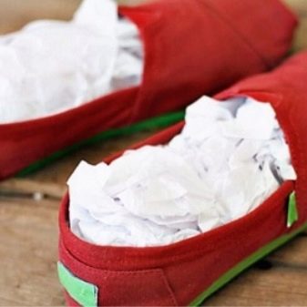 Wenn Sie kein Papier verwenden möchten, werden zum Trocknen Gaze, Watte und sogar saubere Bandagen verwendet. Sie sind in Schuhe gestopft, Gaze oder Bandagen sind darauf gewickelt. Danach zum Trocknen an einen trockenen Ort oder an die frische Luft stellen. Wickelprodukte müssen optimal dicht sein. Nachdem die gewaschenen Schuhe auf Materialbasis getrocknet sind, werden ihre Einzelteile mit einer speziellen wasserabweisenden Imprägnierung geschmiert. Dieses Produkt wird im Handel als Spray verkauft. Sie behandeln es mit trockenem Dampf. Sie können dann in die Innensohle einsetzen und das Paar schnüren.
