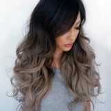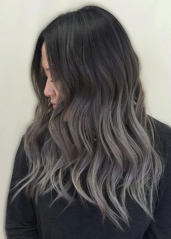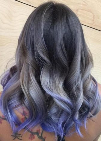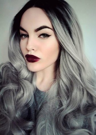 Einer der beliebtesten Trends der letzten Saison für Besitzer von schwarzen und dunkelblonden Locken ist das aschgraue Ombre.In diesem Fall werden verschiedene Graustufen verwendet, wodurch ein eher ungewöhnliches, aber äußerst effektives Bild entsteht. Diese Art der Färbung ist ideal für Damen mit kaltem Farbtyp, weißer Haut und hellen Augen. Bei einer ähnlichen Technik bleiben die Wurzeln unbemalt, der mittlere Teil des Haares ist schwarz oder stahl getönt und die Spitzen werden zu einem rein blonden Platin- oder Perlton aufgehellt.