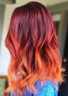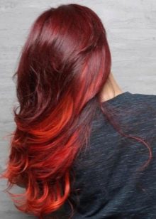 Frauen mit roten Haaren können verschiedene Modeexperimente durchführen und Übergänge in hellen und dunkleren Farbtönen arrangieren. Wenn das Haar hellrot ist, sind Kombinationen mit Sand-, Karamell- und Honigtönen hier optimal, sie machen das Aussehen weicher. Es ist jedoch auch das umgekehrte Ombre angebracht, das sich in Burgunder- und Weintöne verwandelt. Dieses Ombre sieht besonders stilvoll bei braunhaarigen Frauen mit kaskadierenden Frisuren aus.