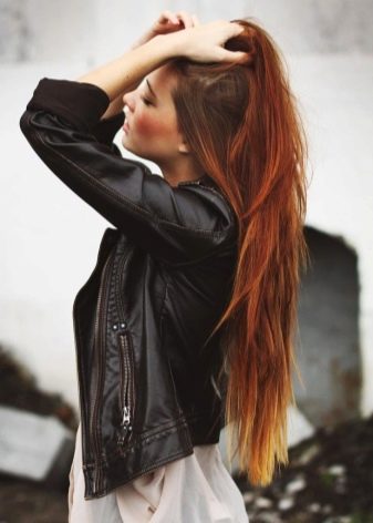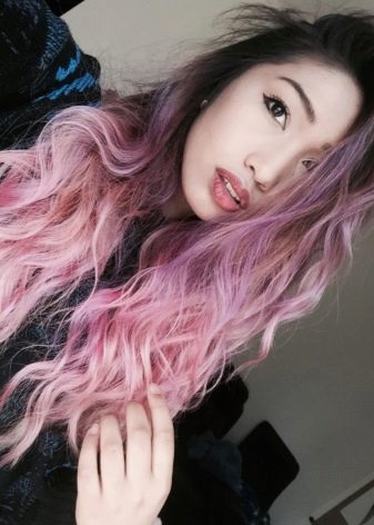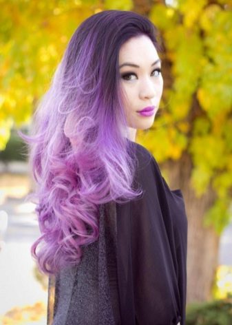 - Umgekehrt - Bei dieser Technik wird ein Farbverlauf von hell an den Wurzeln bis dunkel an den Rändern entworfen. Eine ähnliche Lösung sieht in Kombination mit den violetten oder roten Rändern des Haares harmonisch aus.