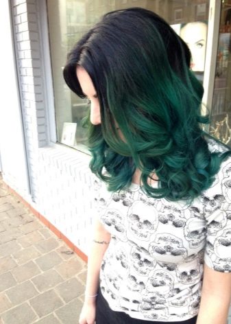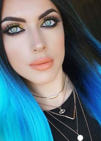 Eine andere Ansicht ist extravagant. Sein Merkmal ist ein scharfer Übergang zur hellen Farbe. Eine weitere Besonderheit ist die Verwendung von Schattierungen und Farben im Kontrast zu natürlichem Haar. Alle hellen Farben, wie z blau, pink, rot, grün. Manchmal sieht es im Gegensatz zur ersten Option unnatürlich aus.