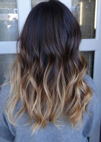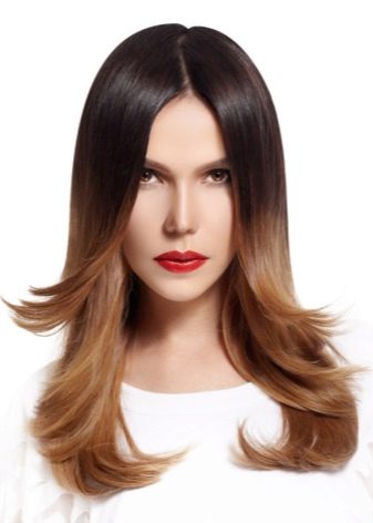 Eine weitere interessante Option ist gepanzert Ombre. Erzeugt den Effekt von überwucherten Wurzeln. Meistens greifen die Besitzer dunkler Haare darauf zurück: braunhaarige Frauen und Brünette. Dies ist genau der gleiche Weg, um Mädchen mit dunklen Haarblondinen zu werden, ohne billig auszusehen.