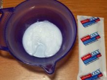 - Vorbereitende. In diesem Stadium ist es notwendig, das Oxidationsmittel nach dem Tragen von Handschuhen mit dem Pulver zu einem Zustand homogener Masse zu mischen. Es lohnt sich auch, auf den Zustand der Kleidung zu achten, damit Sie einen alten Bademantel anziehen oder einen Friseurumhang verwenden können.