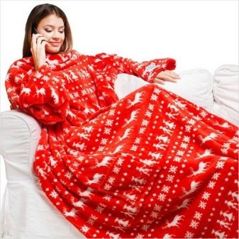 - Plaid mit Ärmeln, verziert zum Beispiel mit Rehen - Ein schickes, praktisches Neujahrsgeschenk, das zu einer Person jeden Alters und Geschlechts passt.Dies ist eine sehr bequeme Sache für diejenigen, die sich gerne unter der Decke sonnen und sich sehr darüber aufregen, dass ihre Hände oft draußen sind - hier sind die Decken überall, nicht nur im Bett, und Ihre Hände sind vor Kälte geschützt. Mit einem solchen Zubehör ist es bequem und warm, auf dem Tablet zu spielen, zumindest Socken zu stricken.