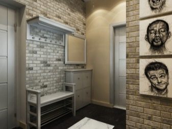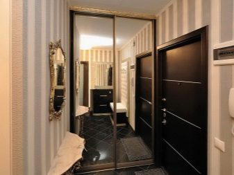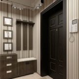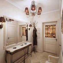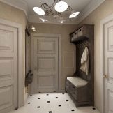 Für eine kleine Eingangshalle in einer Einzimmerwohnung sind zusätzliche Dekorationselemente eine Fehleinschätzung des Designs. Helle Farben und Kombinationen, große Muster und Zeichnungen füllen den Raum nicht weniger als Innenausstattung. Spiegel an gegenüberliegenden Wänden multiplizieren den überlasteten Innenraum mit zwei weiteren Räumen. Minimalismus und Konservatismus werden bei der Gestaltung des kleinen Flurs als Grundlage herangezogen.