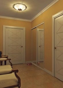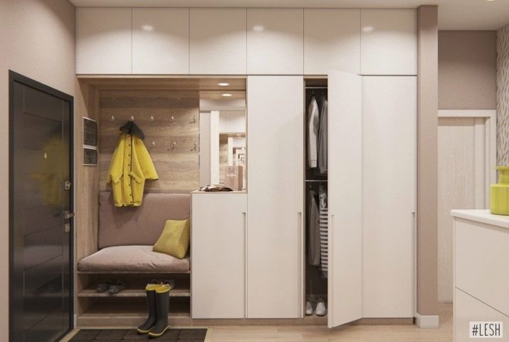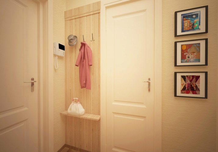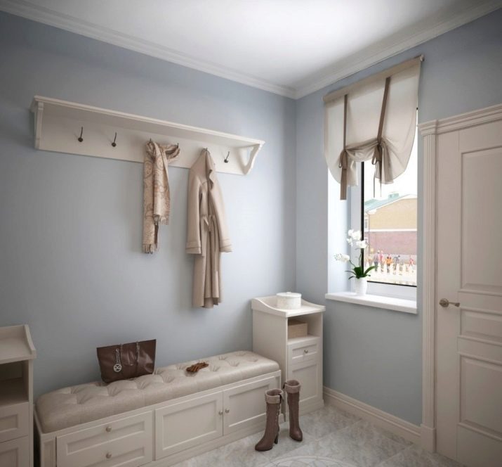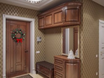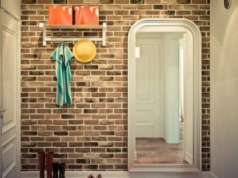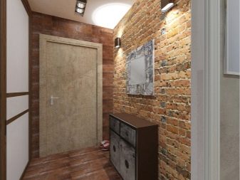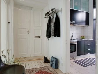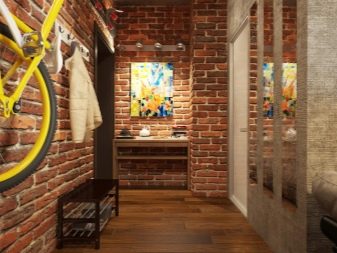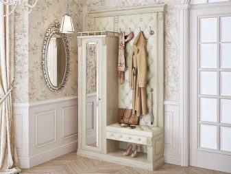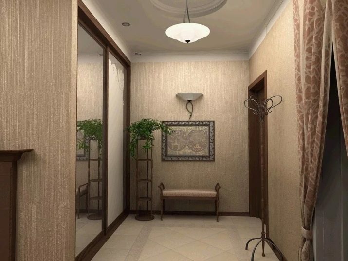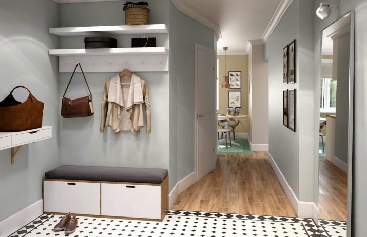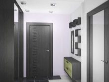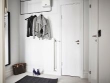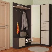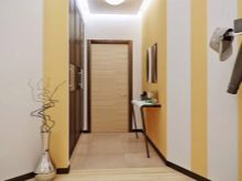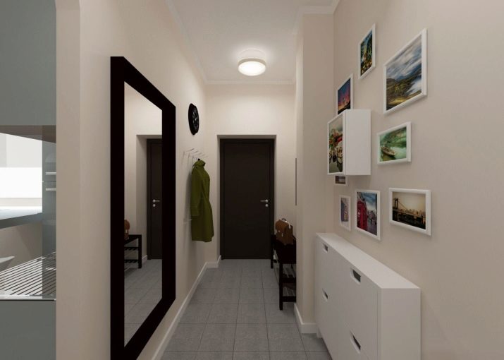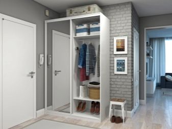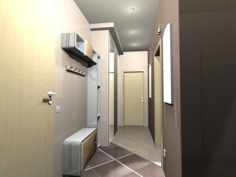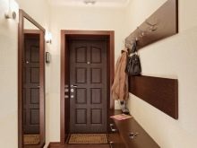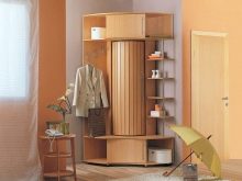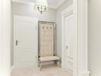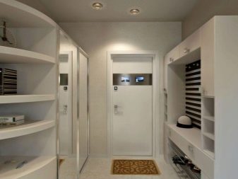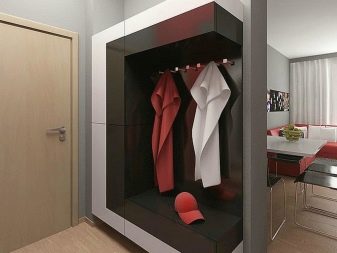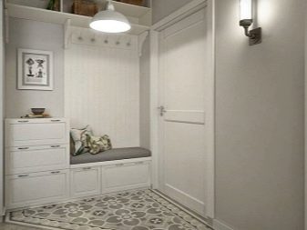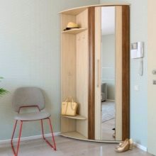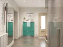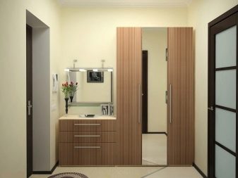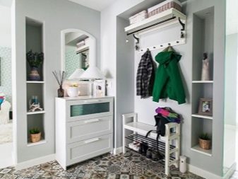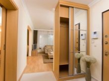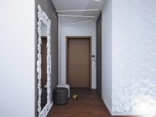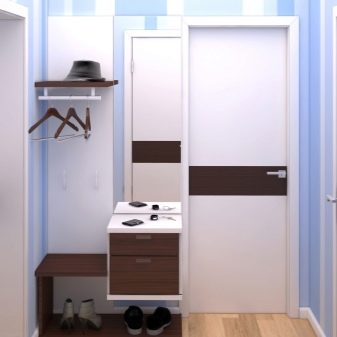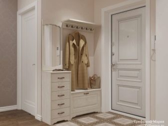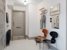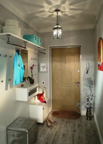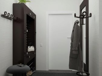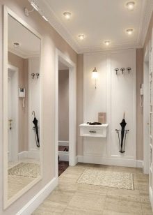 In einem engen Flur wird ihnen nicht geraten, zu stellen sperrige Schränke mit Spiegeln. Der Spiegel wird an die Wand gehängt oder die Eingangstür wird gespiegelt. An den Wänden sind flache Schuhkartons mit speziellen Ablagefächern angebracht. Über der Tür befindet sich ein Zwischengeschoss. An der Wand ist ein Kleiderbügel mit Haken und einer Stange für Kleiderbügel montiert.