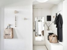 Die helle und geräumige Eingangshalle im skandinavischen Stil wirkt modern und komfortabel. Das Wichtigste im Innenraum ist der freie Raum. Wichtige Komponenten: Fliesen mit hellen Mustern auf dem Boden, gestrichene oder weiß getünchte Wände, Funktionsmöbel aus natürlichen Materialien oder hochwertige Imitationen (Holz, Textilien, Leder). Die Hauptfarbe ist Weiß, kombiniert mit Blau, Hellgrün, Grau oder Schwarz.