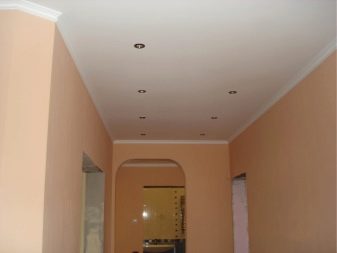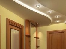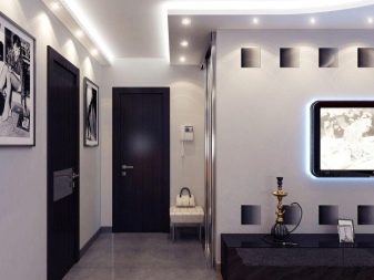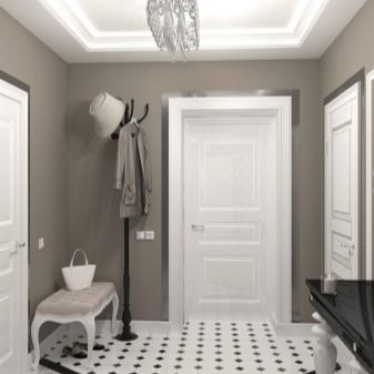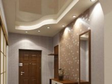Ein kleiner Raum kann mit speziellen Techniken visuell vergrößert werden. In der unteren Eingangshalle wird für die Dekoration der Decke ausgewählt weiße Farbe oder ein anderer heller Ton. Zweistufige Gipskartondecke Es erhöht auch die Höhe des Raumes: außen gibt es einen weißen Rahmen und in der Mitte eine Spiegelfläche. Für schmale und hohe Räume können Sie Optionen mit dunkler glänzenden Decken als Wanddekoration in Betracht ziehen.