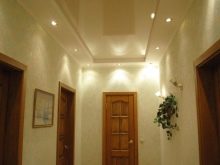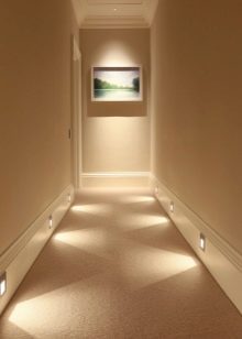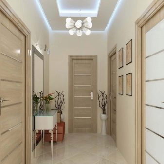 Es sollte keinen Unterschied in der Helligkeit des Lichts zwischen dem Flur und anderen Räumen geben. Die Lampen werden mit warmer Strahlung ausgewählt, vorzugsweise alle gleich.