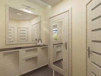 Im modernen Design wird häufig ein mehrstufiges Beleuchtungssystem verwendet. Verschiedene Lichtquellen sind praktisch und praktisch: Um Kleidung in einem Schrank zu finden oder in einen Spiegel zu schauen, müssen die oberen hellen Lampen nicht eingeschaltet werden.