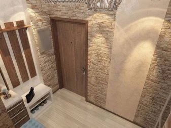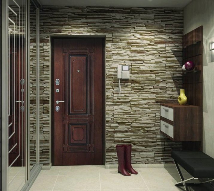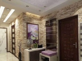 Beliebt bei zeitgenössischen Designern bei der Dekoration von Fluren Stein, Ziegel oder dekoratives Design für sie. Materialien werden in hellen oder pastellfarbenen Farbtönen ausgewählt. Wenn ein Ornament verwendet wird, das nicht hell, sondern gedämpft ist, werden mittelgroße Muster oder breite Streifen bevorzugt.