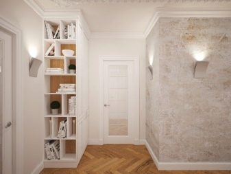 Für die Dekoration von Wänden und Decken werden helle Farben bevorzugt. Dunkle Möbel und Türen überlasten auch einen winzigen Raum, daher ist es besser, eine Pastellpalette oder eine weiße Farbe zu wählen.In engen Gängen und Fluren sind die Wände mit haltbaren Materialien versehen: Zierputz, Stein, Lamellen sind geeignet. Eine Wand ist mit einer Art Tapete oder Putz bedeckt, der Boden ist nicht mit Fugen überlastet und es sollten mehrere Lichtquellen vorhanden sein.