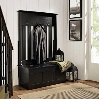 Ein kleiner Raum bereitet den Eigentümern einige Schwierigkeiten bei der Platzierung von Möbeln, aber das vollständige Aufgeben einzelner Gegenstände ist ein Fehler. Im Flur muss vorhanden sein: Kleiderbügel, Spiegel und Teppich. Der Spiegel und die Kleiderbügel sind an der Wand angebracht, und die Matte sollte mittel oder groß gewählt werden. Wenn zusätzlich zu diesen Artikeln ein schmales Regal für Schuhe passt, können Sie ein Modell mit einem Hocker abholen.