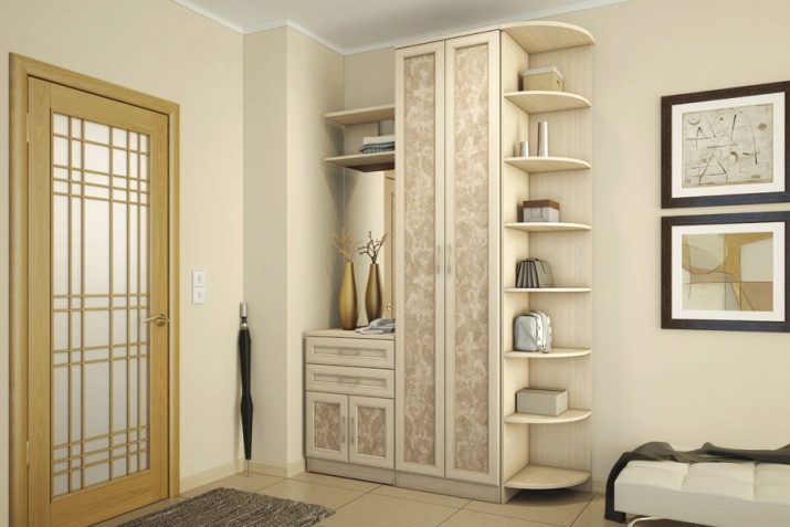 Radeln Sie die Ecken. Ein Eckschrank mit Regalen oder ein kleiner Schrank passt gut zwischen die Wände in einem quadratischen Flur.