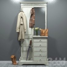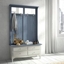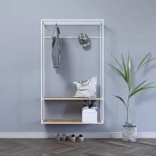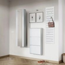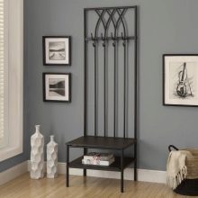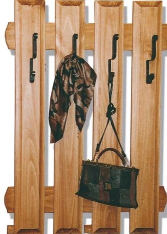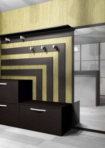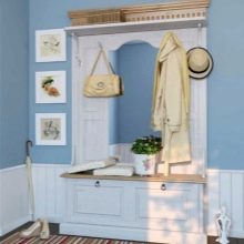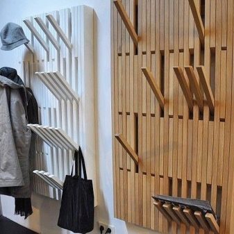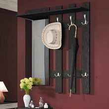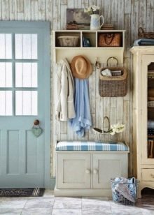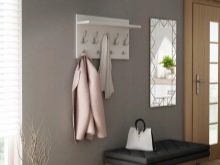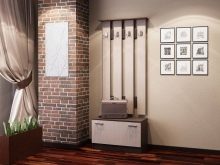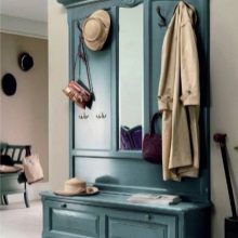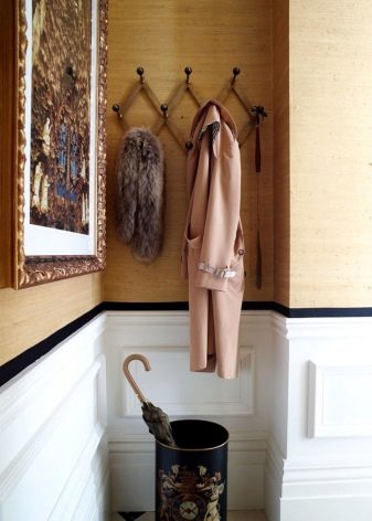 - Wandaufhänger kann in Form eines Klappbretts mit Haken für Kleidung dekoriert werden. Diese Option sieht jedoch so prägnant aus, dass es bevorzugt wird, sie in einer Zusammensetzung aus mehreren Lamellen anzuordnen, die in unterschiedlichen Höhen entlang einer Wand angeordnet sind, oder mit einem offenen Regal mit Scharnier zu kombinieren. Dieses Modell wird durch andere Möbel wie eine Ottomane, ein Schuhregal oder einen Spiegel ergänzt.