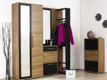 - Mit dem Eckbügel können Sie Oberbekleidung im Schrank verstecken. Der Schrank mit einem Spiegel ist mit einer Schublade ausgestattet, und das Schuhregal kann als Bank dienen. Die Details sind prägnant, die helle Farbe des Headsets macht den Raum heller, dunkle Akzente schaffen Volumen. Gleichzeitig wirkt der Kleiderbügel dank des unauffälligen Holzmusters beeindruckend und edel.