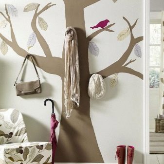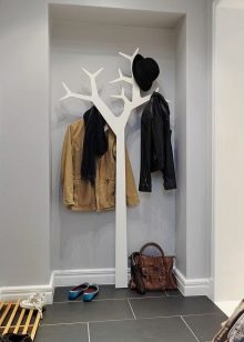 - Eigene Ideen tragen dazu bei, eine elegante Eingangshalle zu schaffen. Als Basis können Sie eine einfache Zeichnung oder Silhouette (Baum, Schneeflocke, Blume) nehmen, an der Wand anbringen und lakonische Elemente (Haken, Regale, Pouffes, Spiegel) auf bequeme Weise platzieren.