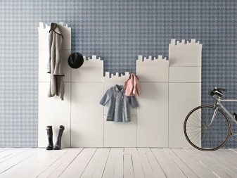 - Wenn die Familie ältere Menschen und Kinder hat, kann der Kleiderbügel mit einer separaten Reihe von Haken ausgestattet werden, die auf der Höhe der Hand platziert sind. In dieser Höhe lässt sich bequem eine Tasche, ein Löffel für Schuhe oder so aufhängen, dass das Kind selbst nach seiner Jacke greifen kann. Es versteht sich, dass je größer die Familie ist, desto mehr Haken sie benötigen, desto breiter ist der für den Kleiderbügel reservierte Bereich.