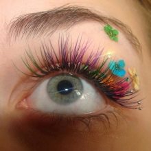- Fantasie. In diesem Fall werden synthetischen Zilien Federn, Strasssteine und farbige Elemente hinzugefügt. Dieser Aufbau erfolgt normalerweise für einen Abend zu einem bestimmten Bild. Der Master verwendet instabilen Kleber, der 24-48 Stunden halten kann. Dann werden die Wimpern entfernt.