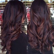 Bei der Auswahl eines Farbtons ist es sehr wichtig, den Farbtyp der Frau zu beobachten, damit der Übergang natürlich aussieht, nicht ins Auge fällt, sondern Aufmerksamkeit erregt. Am schwierigsten ist es, einen Shuttle-Mantel auf schwarzen Haaren aufzutragen, aber es wird interessant sein, sie für eine Farbversion des Färbens zu betrachten.