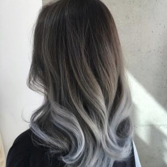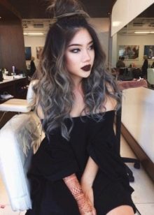 Ein aschfahler Farbton sieht auf dunklem Haar ungewöhnlich und sehr beeindruckend aus. Einige mutigere Mädchen fügen dann einen violetten oder rosa Farbton hinzu.
