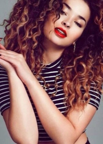 Mädchen mit Locken von Natur aus von dunkler Farbe sollten besser auf eine kalte Palette achten, die ein paar Töne heller ist als natürliche Locken. Dunkelblonden Damen wird empfohlen, Honig, Gold als Komplementärfarben zu verwenden.