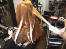 - Tragen Sie kurze, zufällige Farbstriche auf die gekämmten Stränge auf und mischen Sie sie vorsichtig. Es ist wichtig sicherzustellen, dass das Produkt nicht in den Stapel eindringt, sondern hauptsächlich an den Spitzen verweilt, da sonst die Wirkung von verbranntem Haar nicht funktioniert.