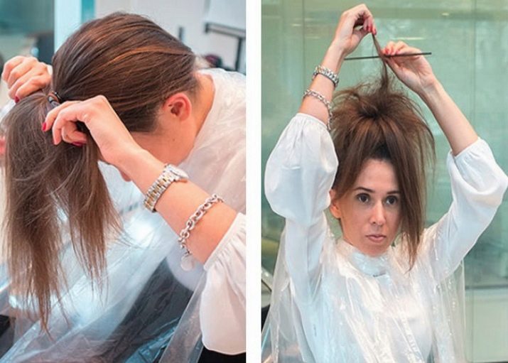 - Sammle Haare in einem Pferdeschwanz. Um ein auffälligeres Ergebnis zu erzielen, müssen Sie es näher an die Stirn binden und für einen weniger ausgeprägten Effekt - auf der Oberseite des Kopfes.