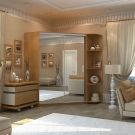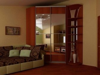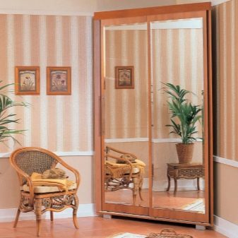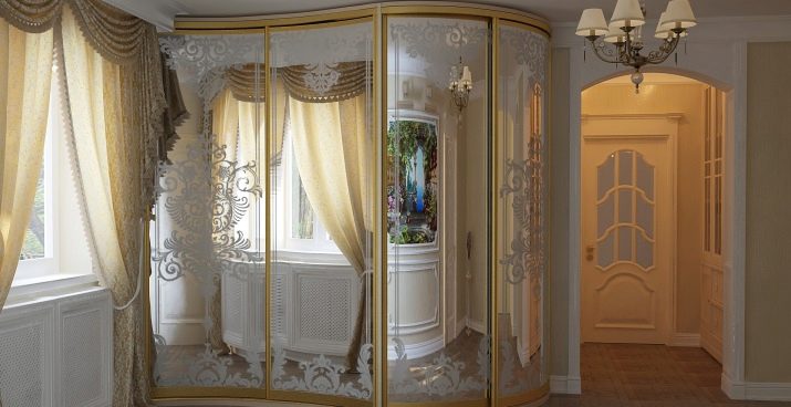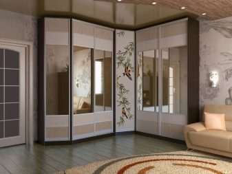 Spiegelschrank erweitert optisch den Raum, macht den Raum größer, tiefer. Darüber hinaus ist es einfach praktisch - es gibt etwas zu suchen, wenn nötig. Darüber hinaus kann eine Vielzahl von dekorativen Variationen als Vorteil eines Schranks mit Spiegel angesehen werden. Auf den Spiegel können Sie jedes Muster, Ornament oder Muster auftragen, das dem allgemeinen Stil des Wohnzimmers entspricht. Die Auswahl an Dekor ist riesig, es wird auf verschiedene Arten angewendet: mit einem Sandstrahl oder einem Orakel.