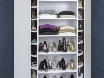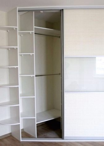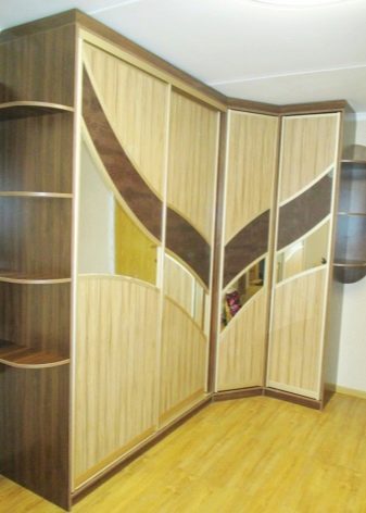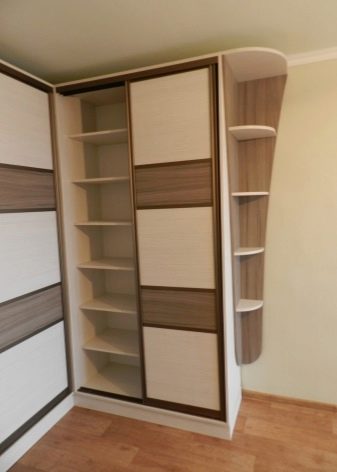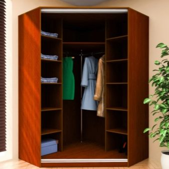 Dieses Modell verbirgt die Ecke selbst, ohne viel Platz zu beanspruchen. Sehr kompakte Art von Schränken, aber ihr innerer Inhalt ist ziemlich eigenartig und nicht für jeden geeignet. Innerhalb der Struktur bilden sich akute Winkel, deren Zugang schwierig sein kann. Sie müssen beleuchtet sein. Regale dürfen nicht zu tief gemacht werden.