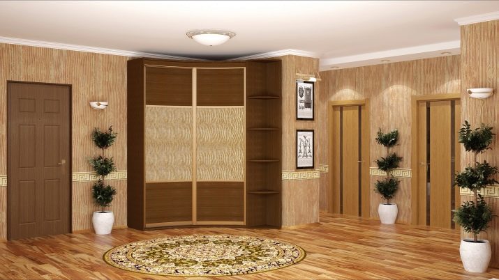 Ein Eckschrank in der Halle ist ein sehr verbreitetes Innendetail. Dies ist eine gute Verkaufsstelle für nicht zu große Wohnungen, in denen es unmöglich ist, ein Ankleidezimmer einzurichten.