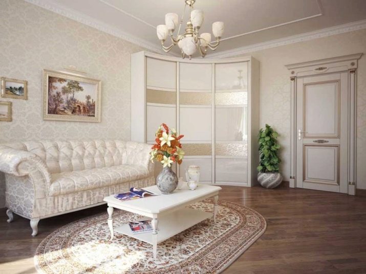 Ein Schrank ohne Spiegel passt gut in ein helles, großes Wohnzimmer im klassischen Stil.