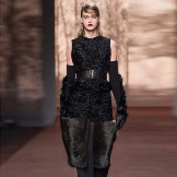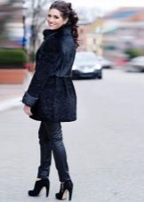 Gerade Anzughosen passen gut zu einem länglichen Pelzmantel. Da Astrachanfell ein spezielles Material ist, ist es besser, keine Lackstiefel zu verwenden, sondern Wildleder oder mattes Leder, das perfekt zum Ton passt.