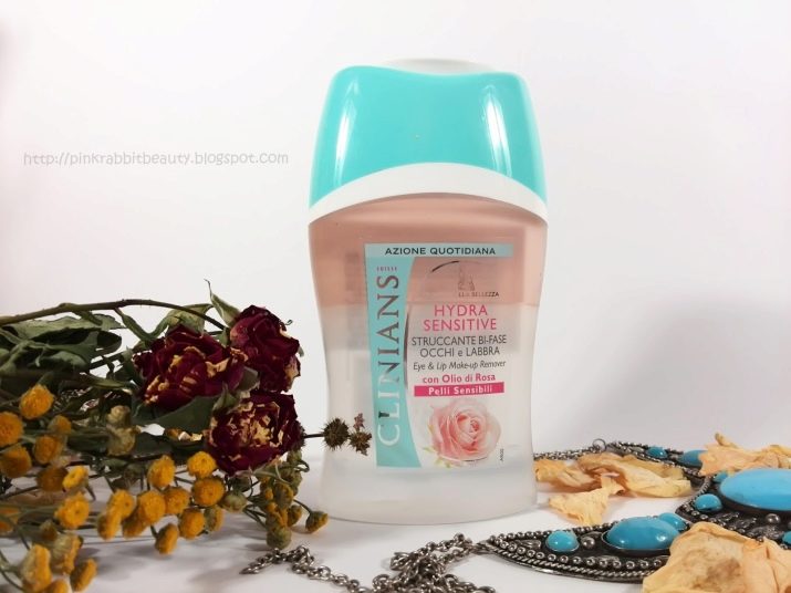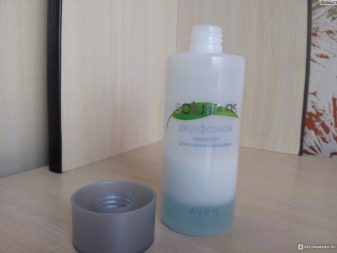 Der zweiphasige Make-up-Entferner besteht aus zwei speziellen nicht mischbaren Substanzen. Einer von ihnen hat ein öliges Substrat und der andere basiert auf Wasser.